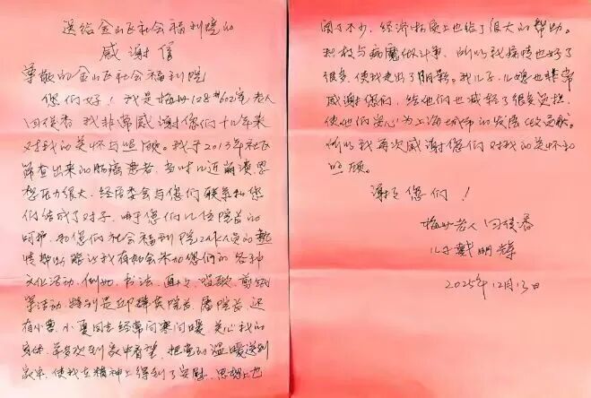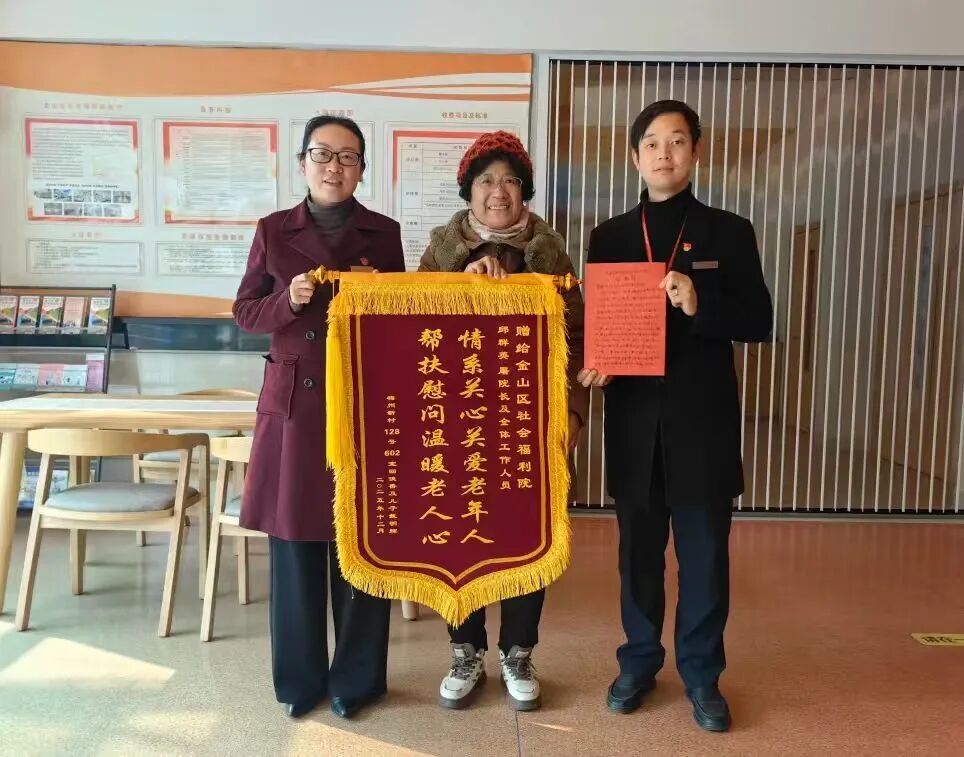 近日,一面写着“情系关心关爱老年人,帮扶慰问温暖老人心”的锦旗,连同一封亲手写的感谢信,被回阿姨亲自送到了金山区社会福利院。