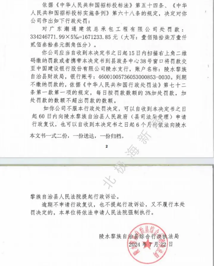 然而,事情的发展并没有因为投标失败而告终。2024年1月,陵水黎族自治县综合行政执法局(以下简称“陵水执法局”)对此立案调查。半年后的7月22日,一纸《行政处罚决定书》送达潮通公司。