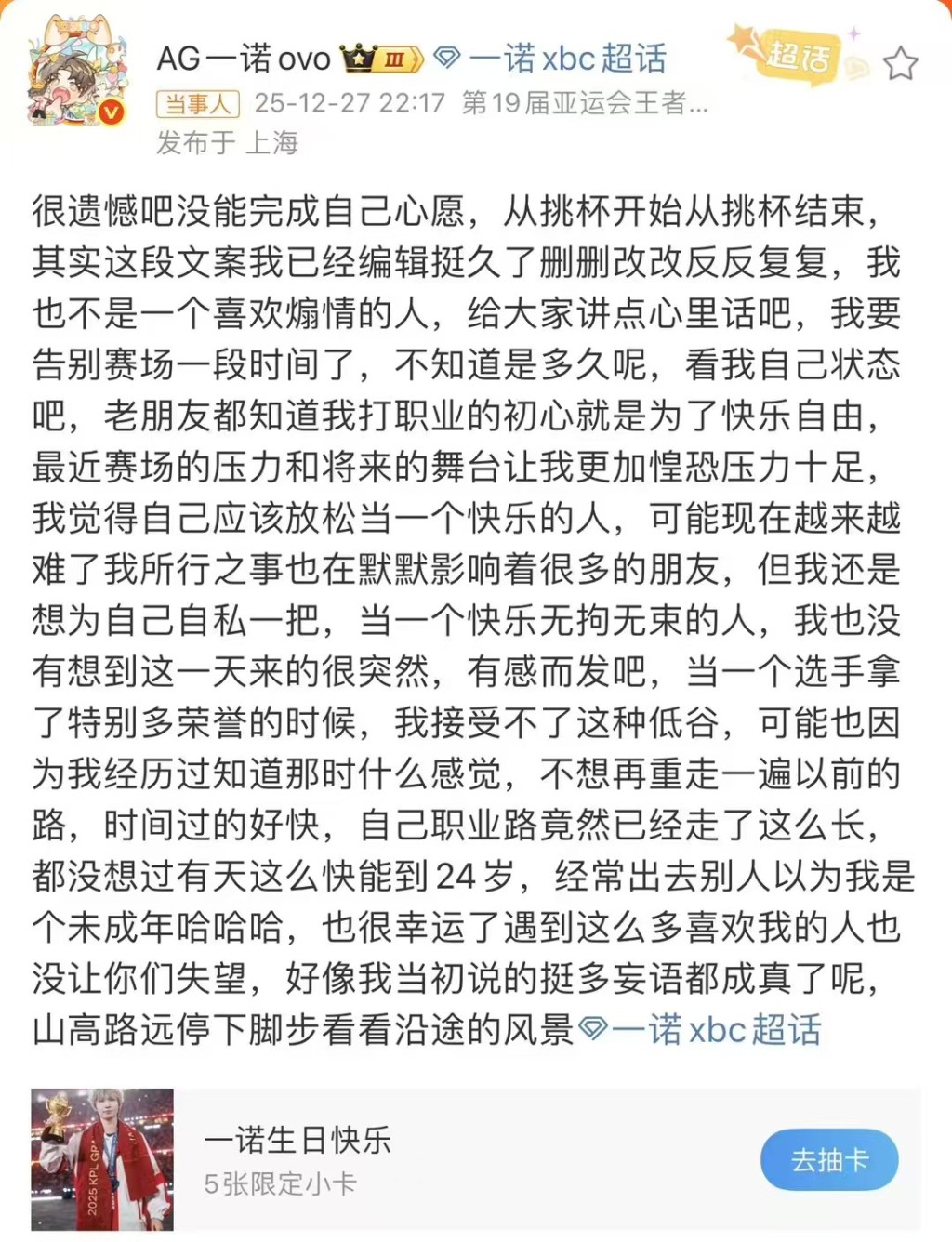 一诺很想拿这个冠军,2025年12月26日生日那一天,他许愿“拿下大满贯”, 未成想到次日就是AG挑战者杯征程的终结,而12月27日当晚,一诺一篇发在个人社交账号上的文字成为了焦点。