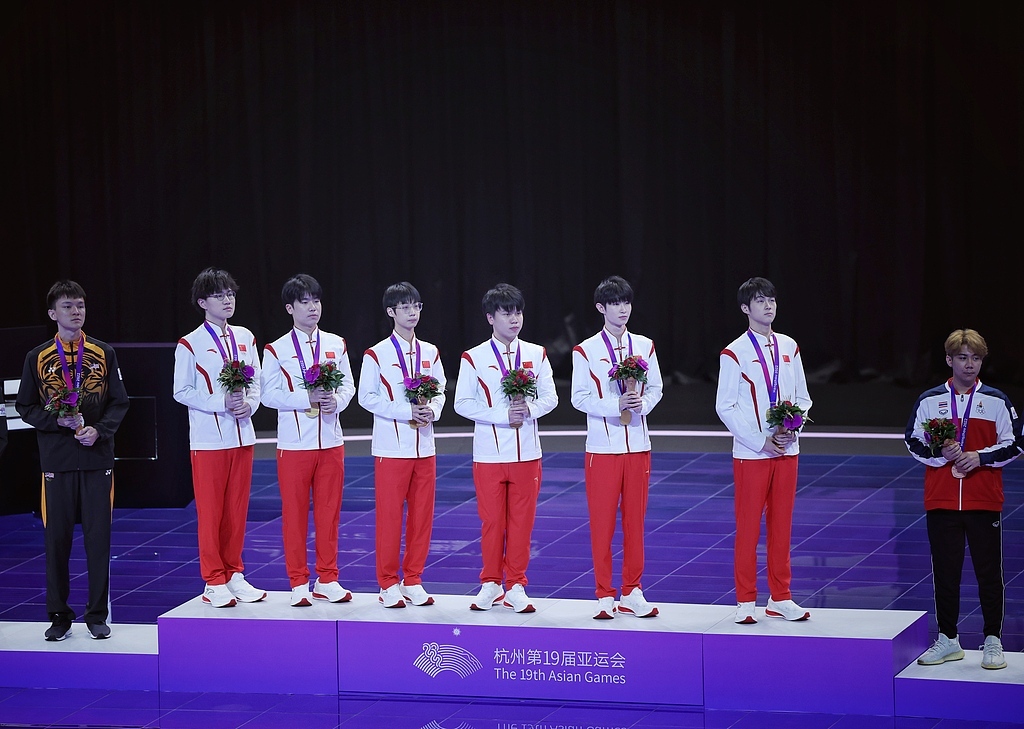 2023年9月26日,在杭州亚运会电子竞技王者荣耀亚运版本决赛中,中国队以2比0击败马来西亚队,夺得金牌。这也是杭州亚运会电子竞技项目诞生的首枚金牌。中国队派出了6位KPL职业联赛选手,分别是孙麟威(坦然)、罗思源(花海)、林恒(暖阳)、池晓铭(Ming)、徐必成(一诺)、蒋涛(阿豆),均发挥出色。视觉中国 图