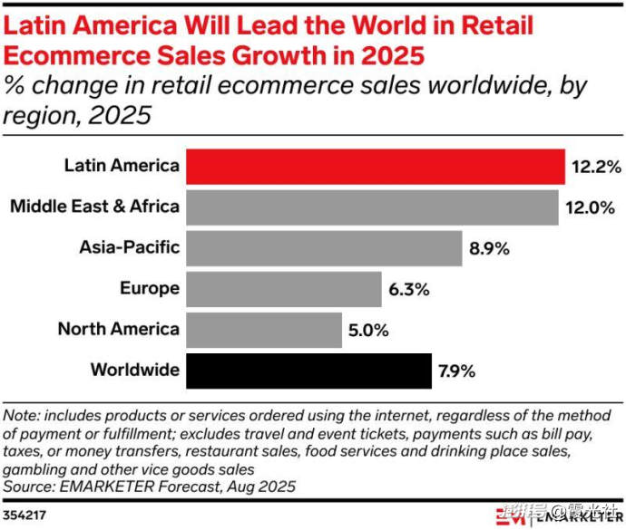 eMarketer 数据显示,2025 年拉美电商市场增速预计达 12.2%,是全球平均水平的 1.5 倍。这不仅是区域市场的爆发,更标志着拉美已成为全球电商版图的核心增长极。这一地区在时隔四年再度登顶全球增速榜首,这一优势将持续至 2027 年,之后其领跑地位将被中东和非洲市场取代。
