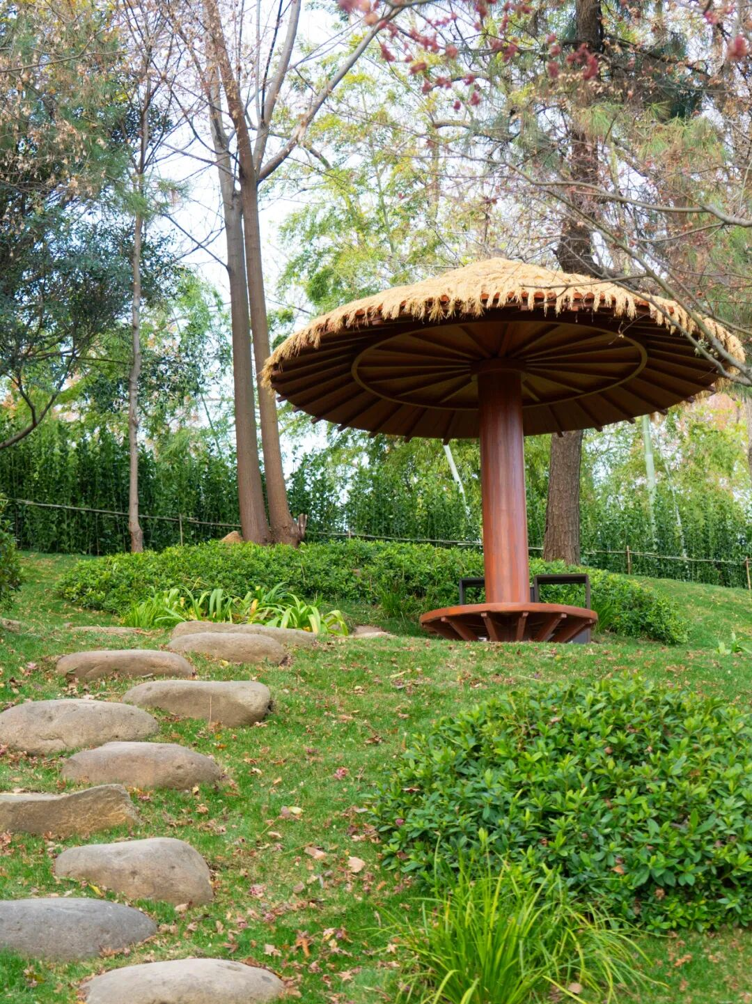 玫瑰园引种新优月季品种,搭配精致廊架与座椅,化身浪漫花海,花园的绚烂与周边绿意无缝衔接。