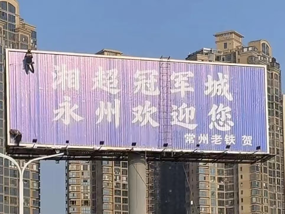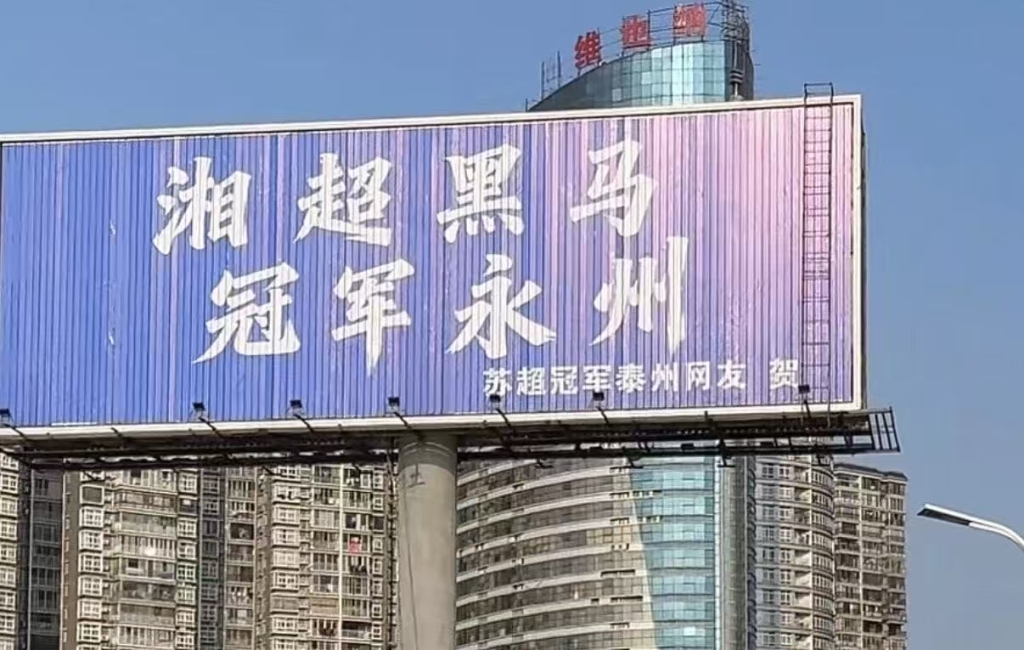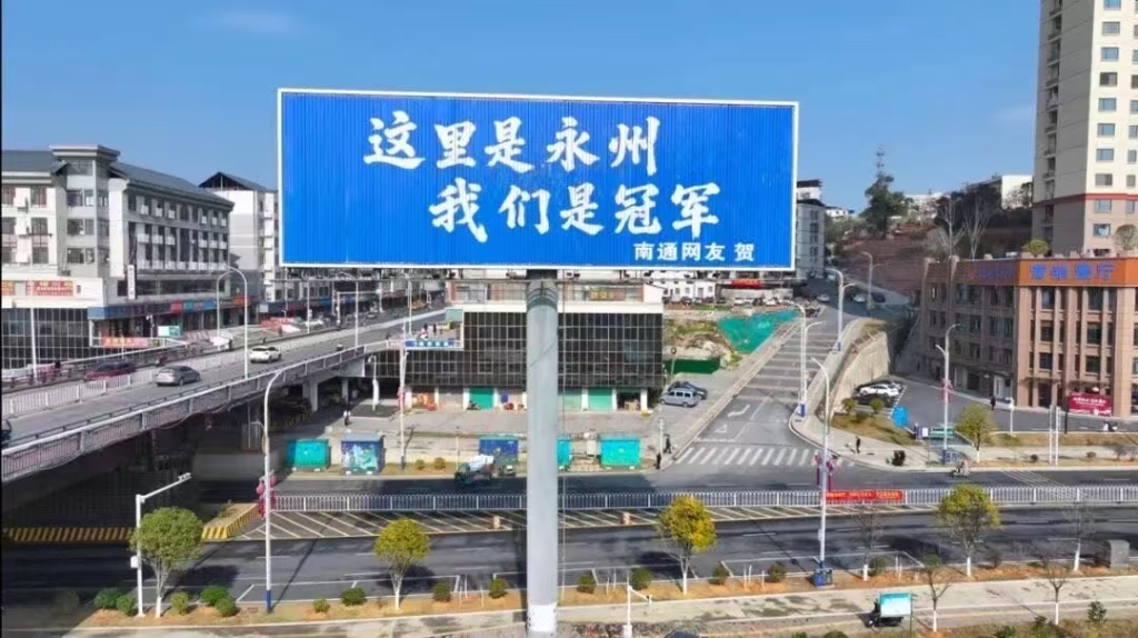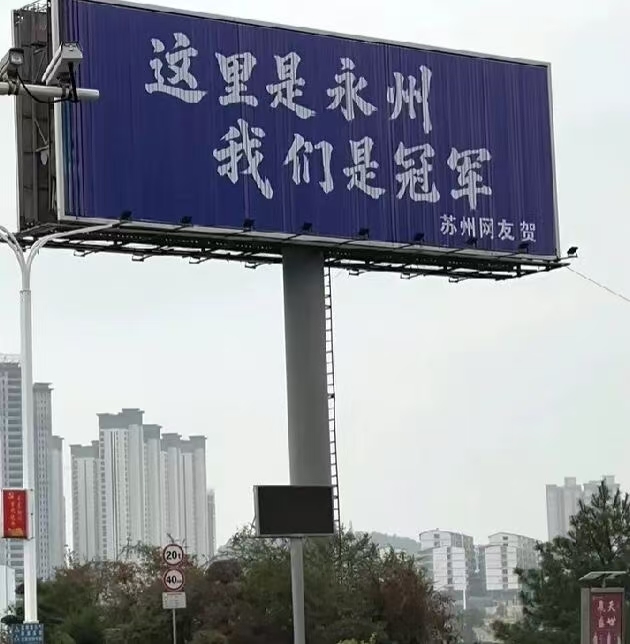 3日,宋家洲大桥桥头的高炮广告位出现了“这里是永州 我们是冠军”的字样,落款“苏州网友 贺”。苏州媒体随后报道,这位网友叫封全昌,是吴江区一家企业的负责人、30多年的老球迷。