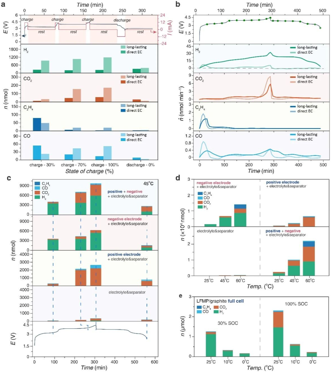 既然要研究化学副反应的产气,那就在充放电过程中把电池停在不同SOC,将正极、负极、带电解液的隔膜,分别丢在几个瓶子里单独静置一段时间后,它们多多少少会产生一些气体。正负极单独静置实验说明(图4c),CO2/CO主要由正极在高SOC下产生,H2则主要源于石墨负极的化学副反应。即使用除水的DMC对负极清洗并简短的进行真空干燥后,干的石墨负极自身仍会分解释放H2(图4d)。