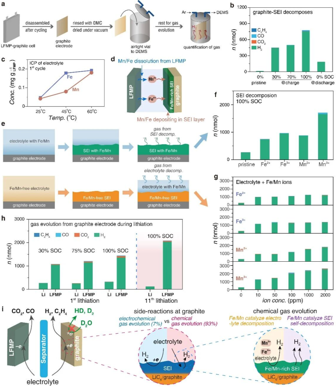 磷酸锰铁锂(LFMP)正极凭借高电压平台和成本优势,成为下一代高能量密度电池的关键材料。但LFMP电池在循环过程中会产生大量H2和CO等可燃气体,该问题与循环过程中正极过渡金属离子(Mn和Fe离子)溶解以及石墨负极分解相关。这些金属离子会催化电解液副反应,然而,由于电池内部复杂的正负极串扰,对于产气来源、产气机理以及溶解金属离子的催化机制仍不明确。