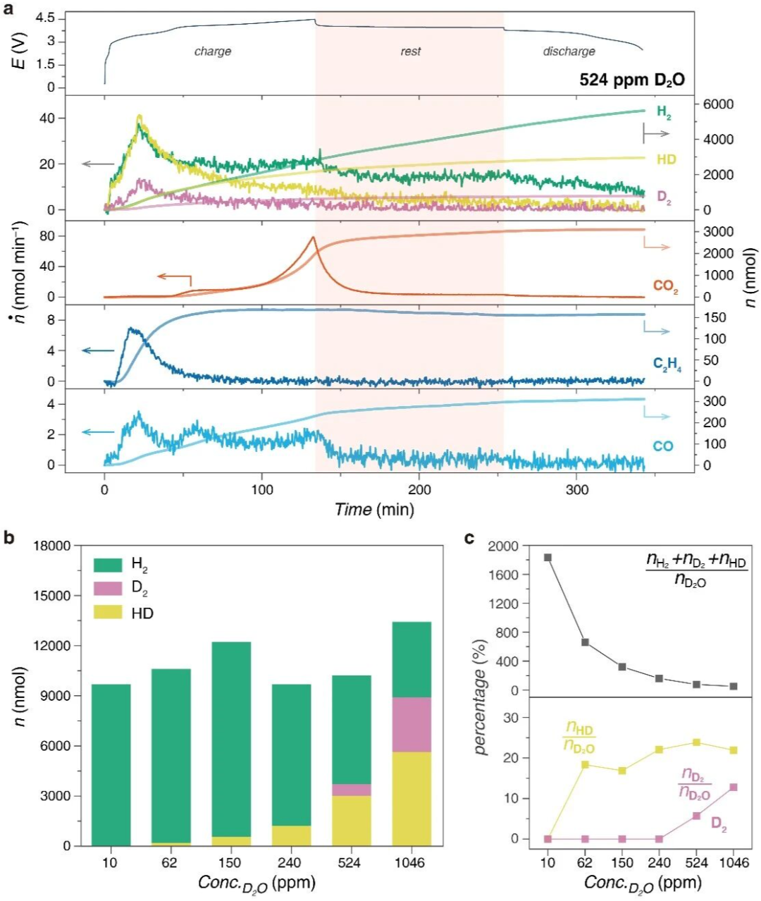 电解液中的水分通常是析氢来源,即使电极、电解液等部分经过干燥除水也难以完全除去水分。通过向电解液中认为添加D2O进行同位素标记,并计算D2/HD/H2的比例可以明确全电池中氢气的来源。结果表明,即使添加524 ppm D2O,析出气体依然以H2为主(图2a);在低D2O浓度(<150 ppm)时未检测到D2,说明氢气主要来源于电解液自身的分解,而不是电解液中残存的水分(图2b)。只有当D2O浓度提升至1000 ppm时,水才会直接在电极表面被还原产生H2。而且即使在1000 ppm D2O中,总氢气产生量并未明显增加,但H2/D2/HD比例随D2O含量变化,表明氢气产生存在多重途径(图2c)。以上结果都说明低水分条件下(<200 ppm)氢气析出的主要是电解液分解及电极间相互反应,而非单纯的痕量水分解。