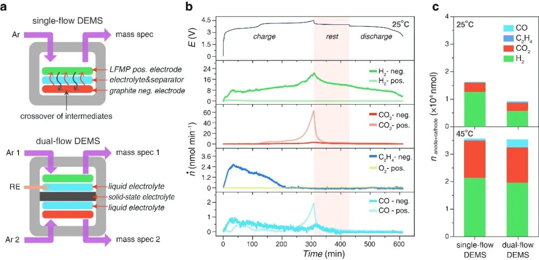 随后作者通过间歇充电实验区分了LFMP电池中气体析出的两种机制:电流驱动下的直接电化学副反应和电流停止后仍持续进行的化学副反应(图4a-b)。结果表明,H2主要来源于持续的化学副反应,且在静置期仍大量持续产生;CO2则主要源于正极且生成量与SOC密切相关。对于H2而言,只有7%来自与直接的电化学副反应,93%来自于化学副反应。当然这个比例不是固定的,会随着充电倍率变化,时间越长的化学副反应的贡献越多。