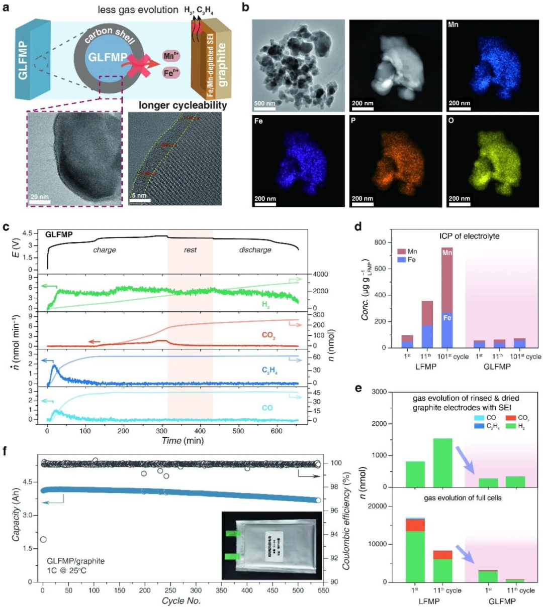 中科致良提供了了一种致密碳层包覆的正极材料(GLFMP),在LFMP颗粒表面形成了均匀且致密(厚度约4 nm)的碳包覆层(图6a-b)。该碳层提升了材料电导率,且能阻隔LFMP与电解液的直接接触,将正极Mn/Fe离子溶出量降低了一个数量级(图6d)。TOF-SIMS分析也证实石墨负极表面的Mn/Fe沉积量减少。DEMS测试显示GLFMP全电池在充放电过程中的产气量明显下降80%以上(图6c, e)。最终组装的4.1 Ah GLFMP软包全电池实现了超过540次的稳定循环(图6f)。这表明,在LFMP正极材料表面构建均匀且致密的保护性碳层,是抑制过渡金属离子溶出、减少副反应产气并提升电池循环寿命的有效策略。