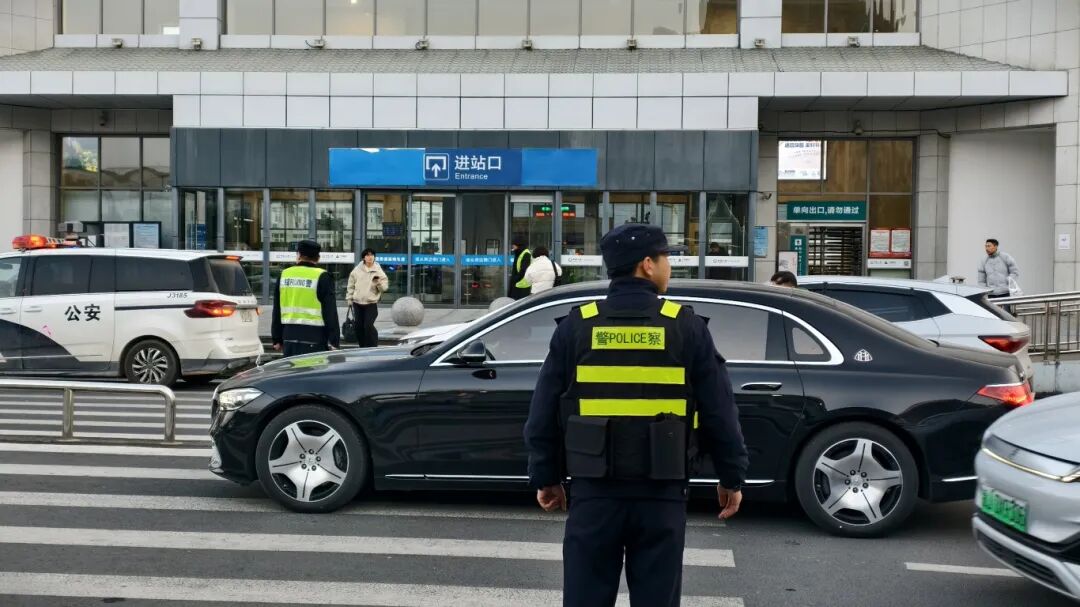 如果说“拉车门”是对街巷平安的精细守护,那火车站及周边园区的治理则是应对复杂场景的攻坚战场。在火车站站前广场,民警引导车辆有序停靠,人车分流,秩序井然。