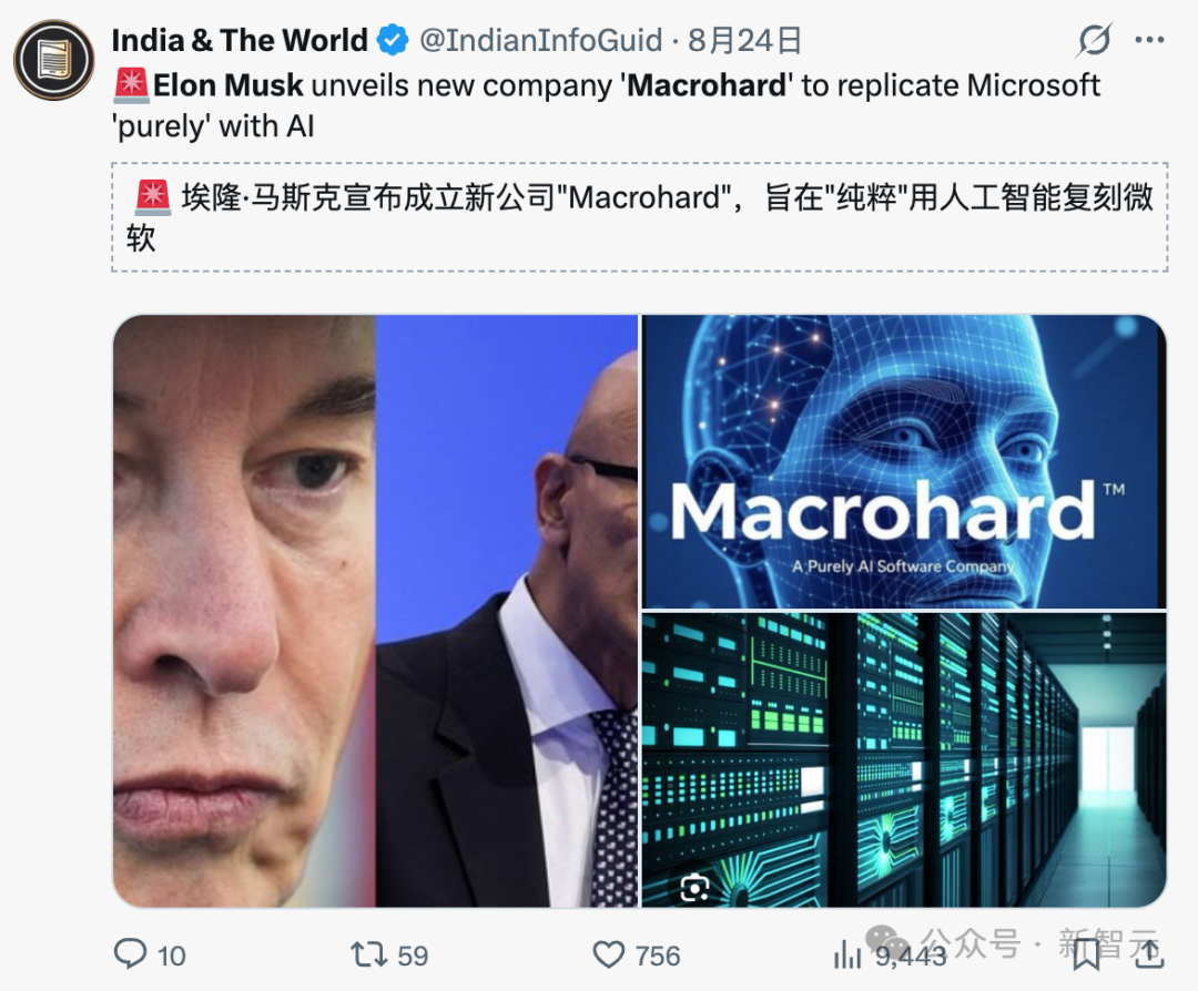马斯克在X上宣称:「加入xAI,帮助建立一家纯AI软件公司,名叫Macrohard。这是一个玩笑的名字,但项目是非常真实的!」