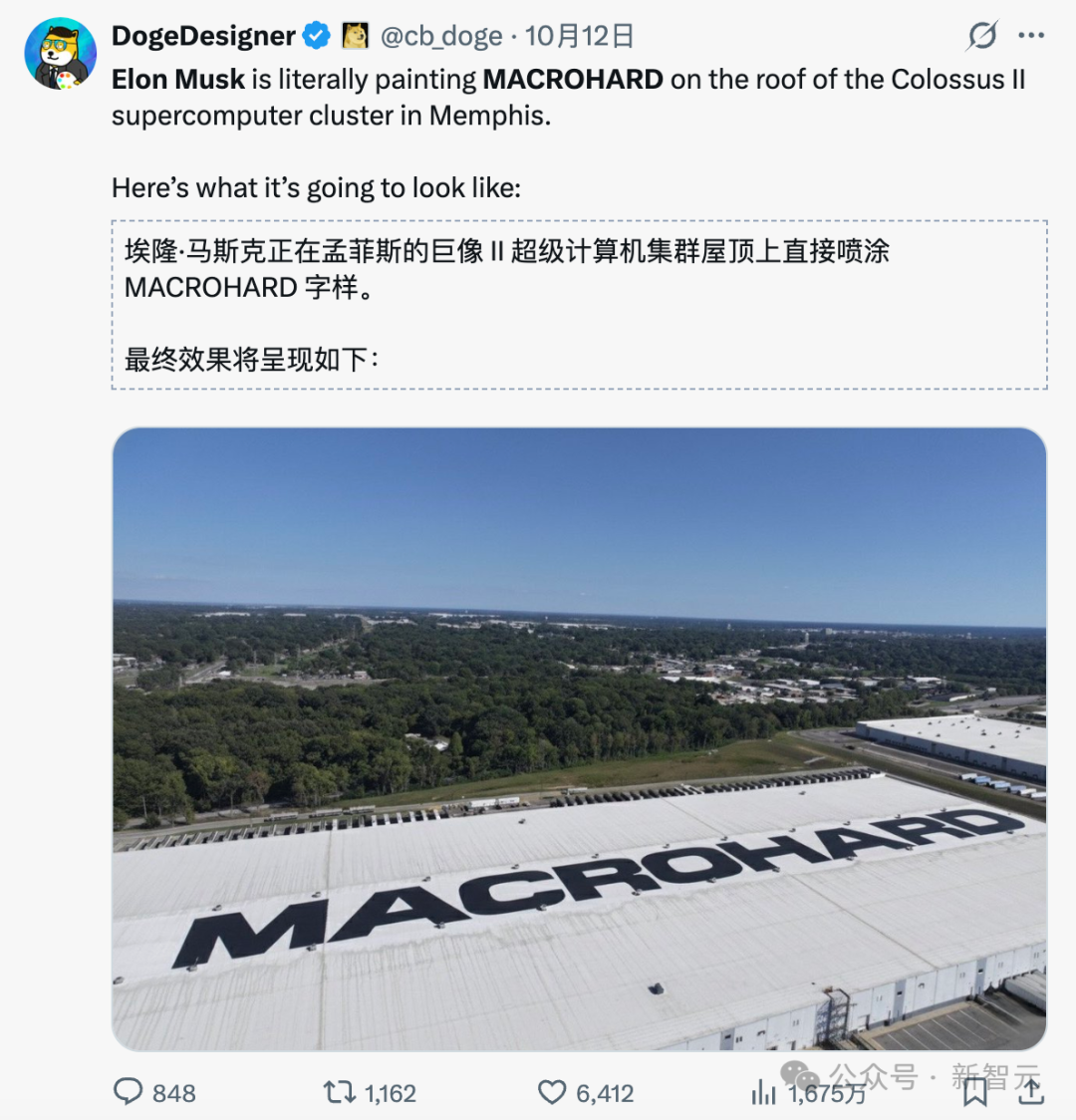 而在Colossus的屋顶上,马斯克让人刷上了巨大的「MACROHARD」标志。