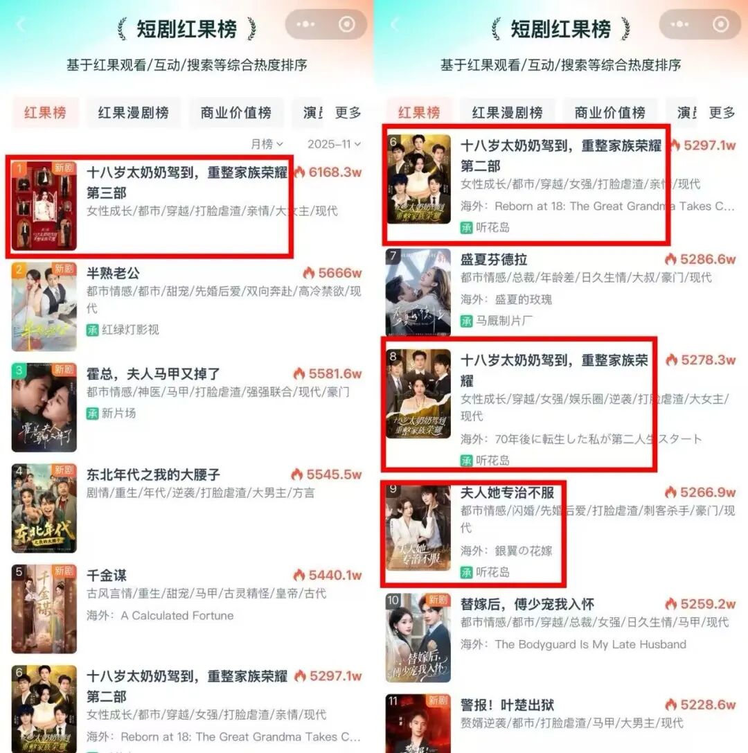 《DataEye红果热榜月榜》11月数据显示,听花岛制作的《十八岁太奶奶驾到,重整家族荣耀 第三部》位居榜首,前10席位里听花岛独占4部,马太效应愈加明显。
