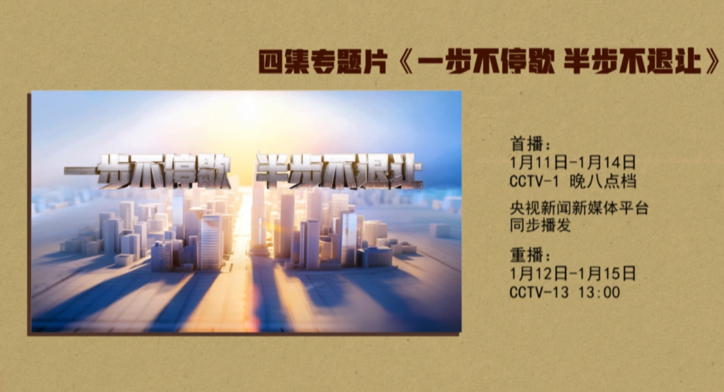 从今日(1月11日)起至14日,由中央纪委国家监委宣传部与中央广播电视总台央视联合摄制的电视专题片《一步不停歇 半步不退让》,将在中央广播电视总台央视综合频道晚8点档播出,央视新闻新媒体平台同步播发。