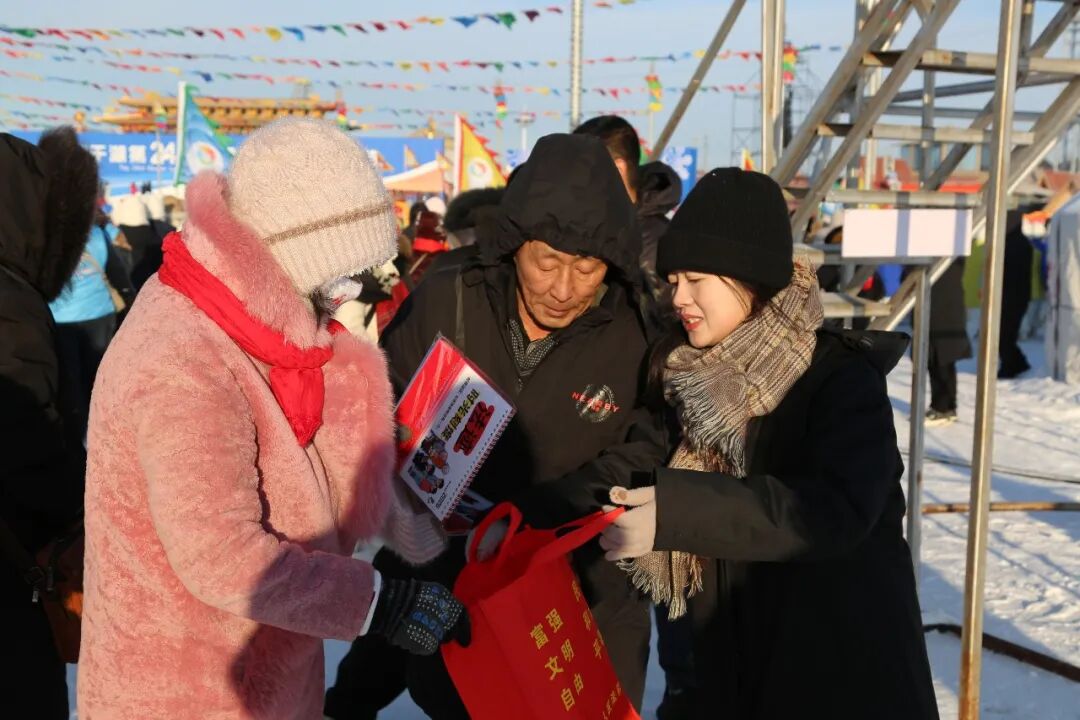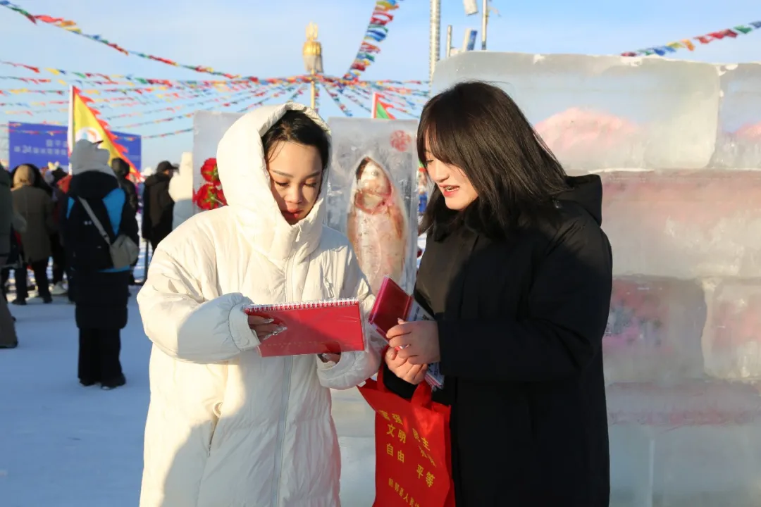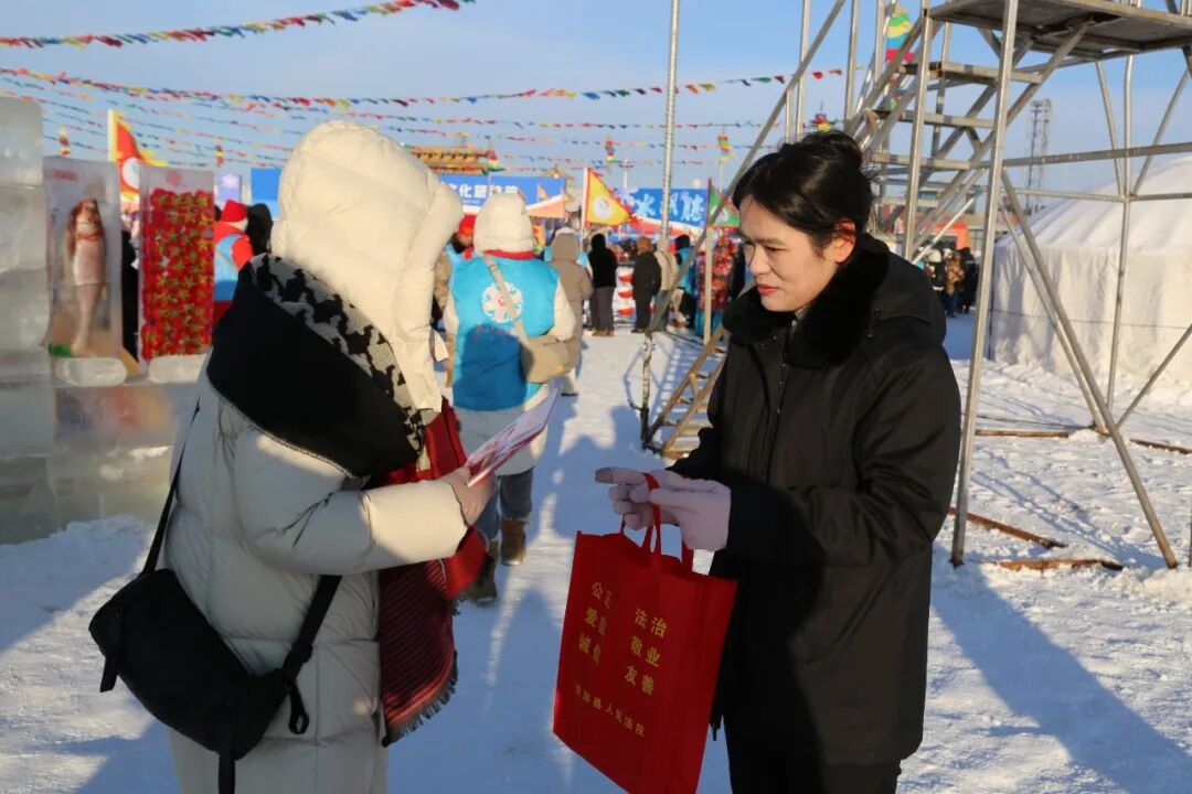 不止于定点服务,法官干警们更是主动化身“法治导游”,将普法阵地延伸至查干湖的各个角落。在捺钵广场,他们结合《中华人民共和国环境保护法》,讲述查干湖“捕大留小、生生不息”的古老渔猎智慧如何与现代环境司法理念相契合;在龙鱼集市,他们解读《中华人民共和国消费者权益保护法》与诚信经营规范,为冰雪经济注入法治力量;面对来往游客,他们温馨地提示安全注意事项与纠纷解决途径,让每一位游客玩得开心更安心。