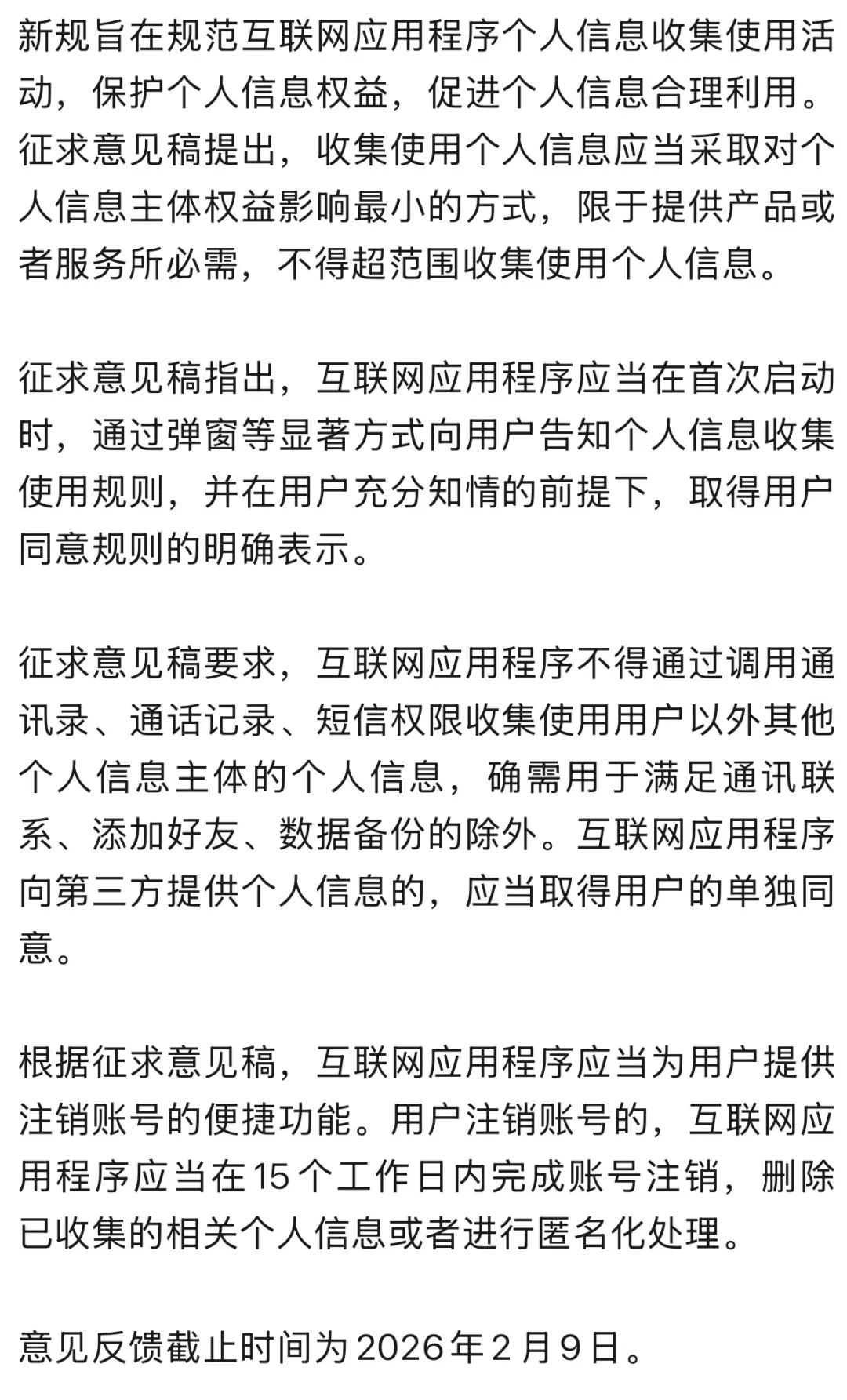 中国国家互联网信息办公室10日就《互联网应用程序个人信息收集使用规定(征求意见稿)》向社会征求意见。征求意见稿提出,互联网应用程序应当仅在用户主动选择使用拍照、发送语音、录音录像等功能时调用相机、麦克风权限,不得在用户停止使用相关功能或者无关场景调用相机、麦克风权限。