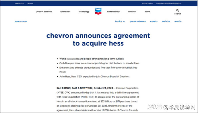 不到两周,第二起重大并购案落地。同年10月23日,美国第二大石油公司、全球五大石油巨头之一——雪佛龙公司宣布,将以全股票交易的方式收购赫斯公司全部流通股,交易价值为530亿美元。包括债务在内,此次交易的企业总价值为600亿美元。