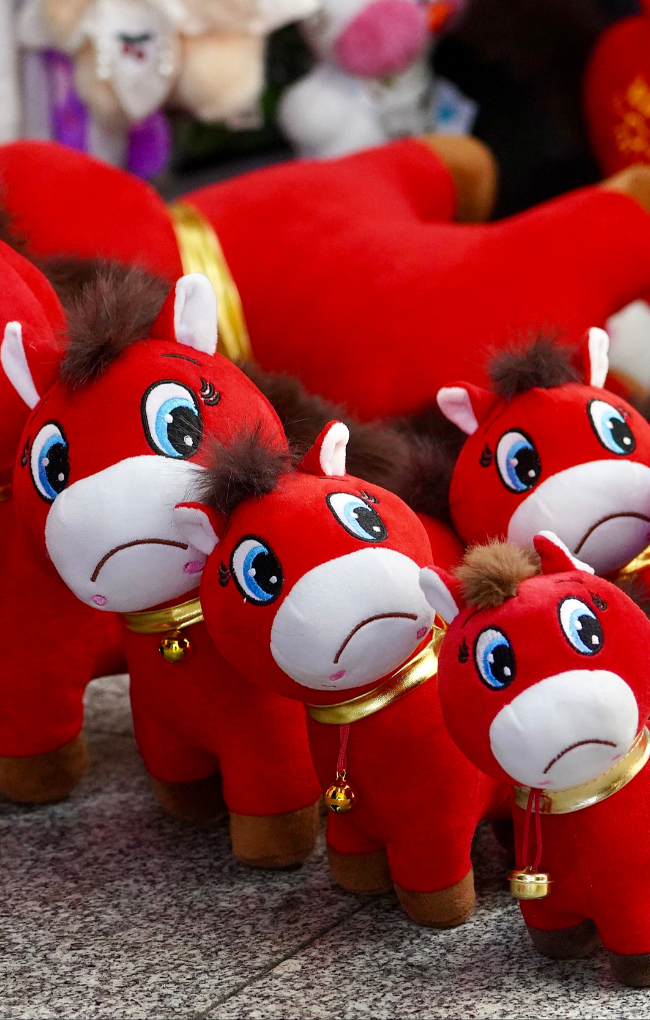 2026年1月11日,浙江义乌,一位小朋友在店门口“试驾”大号的马年毛绒玩具。 中新社记者 董易鑫 摄