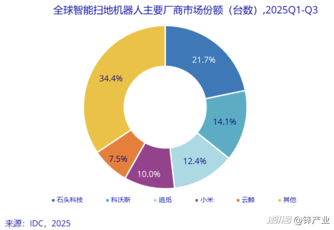 来自IDC的统计数据显示,2025年前三季度,全球扫地机累计出货量为1742.4万台,排名前五的同样都是中国厂商,分别是:石头、科沃斯、追觅、小米、云鲸。