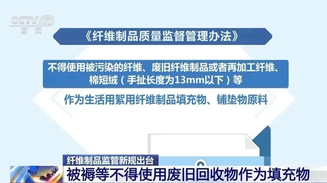 除了对婴幼儿纺织品、校服等实施重点监管,新修订的《纤维制品质量监督管理办法》对絮用纤维制品(即被褥、棉服等)提出严格要求,明确不得用废旧回收物作为填充物。