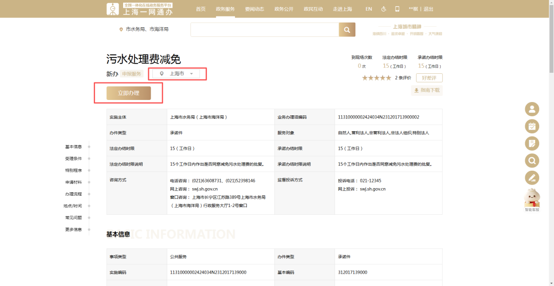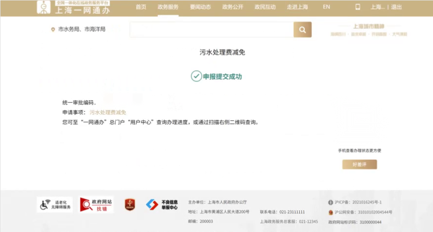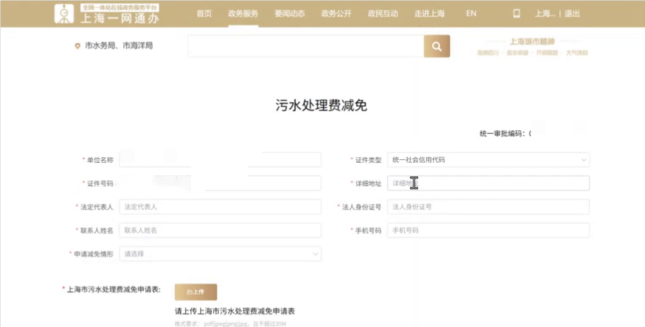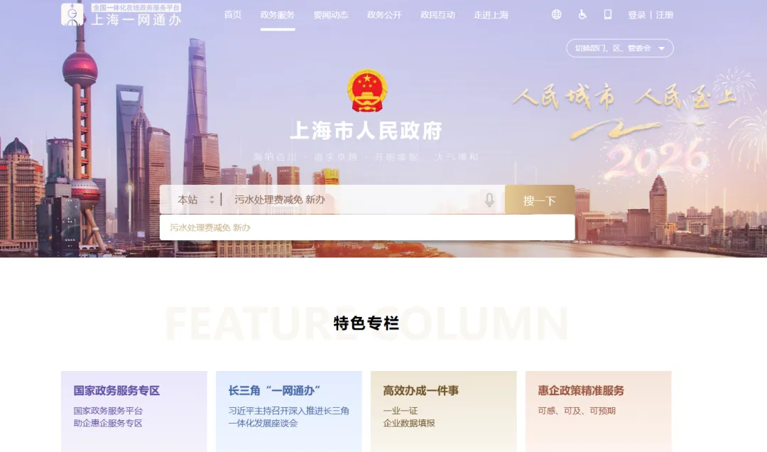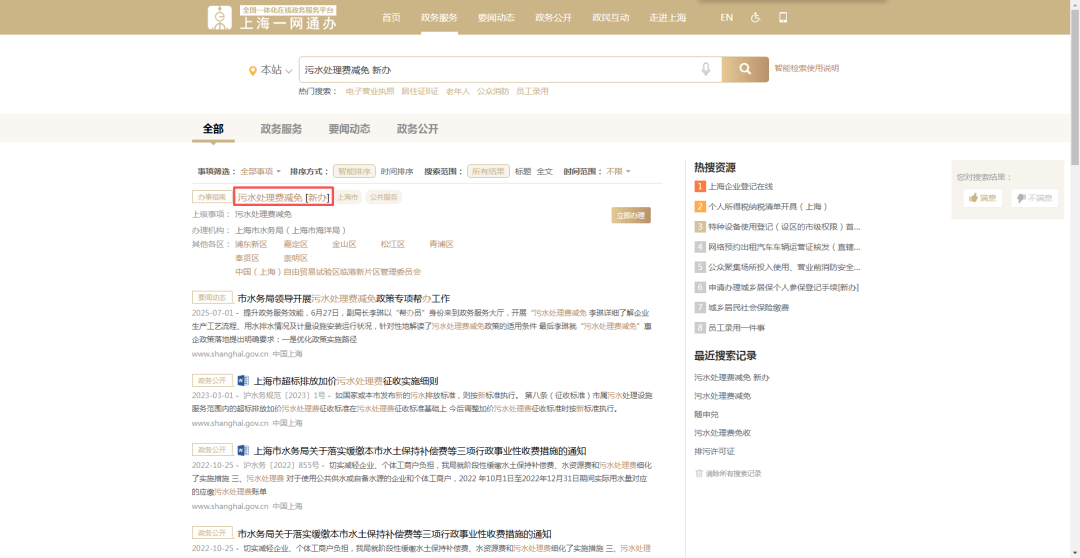 在“上海市一网通办”(zwdt.sh.gov.cn)总门户搜索:污水处理费减免新办。