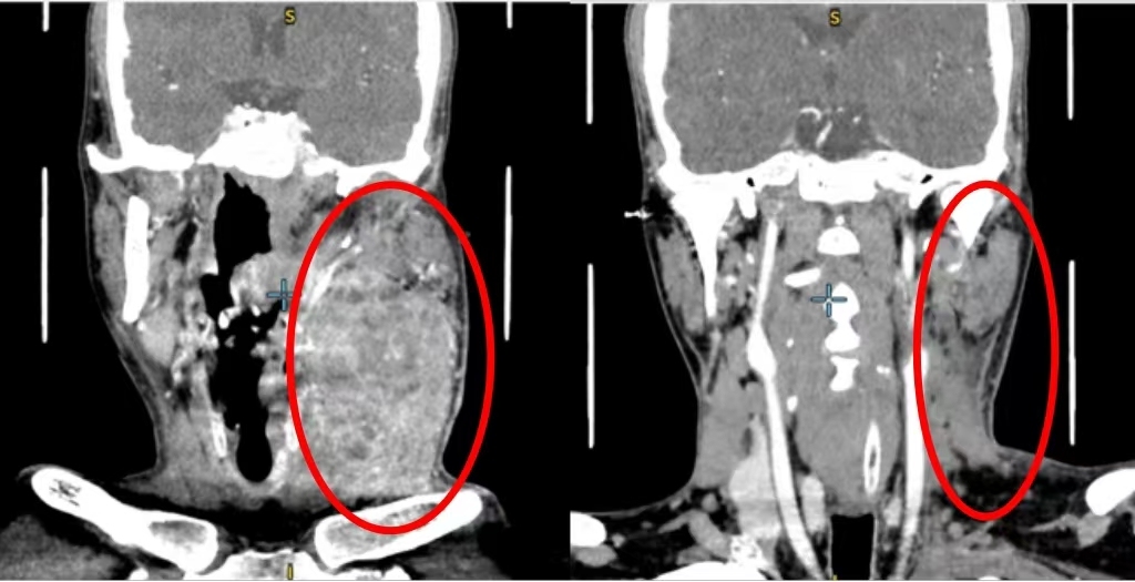 多学科专家会诊后透露,这名患者因肿瘤太大,同时已经发展颈部转移累及到了颈动脉,如果直接手术切除肿瘤,会有死亡风险。为降低手术风险,经评估,专家们决定对这名患者采用个体化治疗:先药物治疗缩小肿瘤,再进行根治性手术,后续再进行靶向治疗、免疫治疗和化疗等联合治疗。
