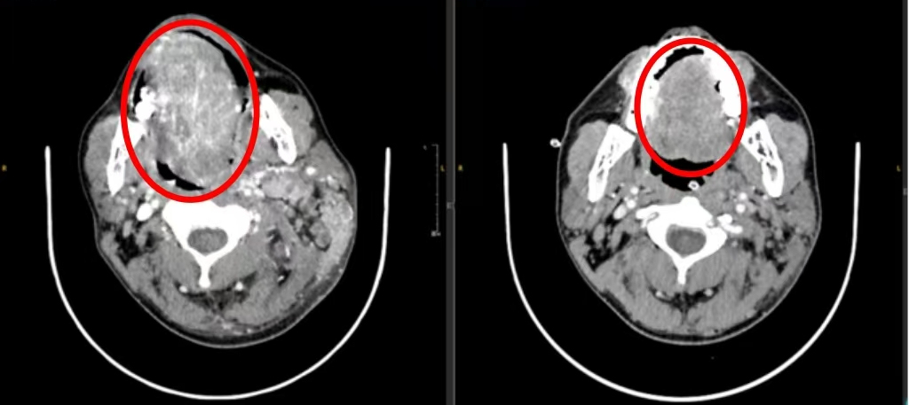 这名33岁患者的影像检查线上,肿瘤病灶从舌头转移到了颈部。