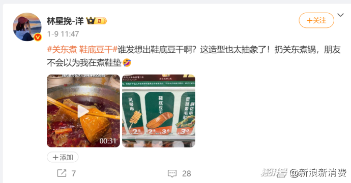 对此,微博网友吐槽“谁想出来的鞋底豆干啊?这造型也太抽象了!扔关东煮锅,朋友不会以为我在煮鞋垫”?