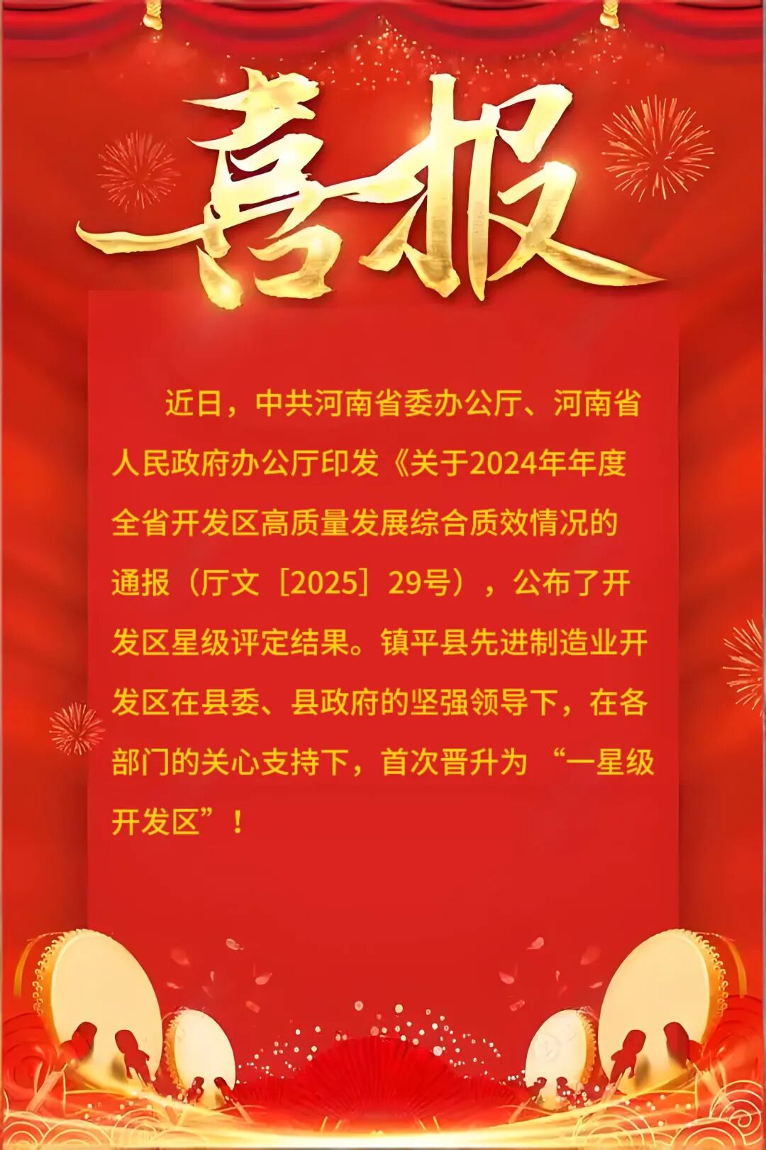 近日,中共河南省委办公厅、河南省人民政府办公厅联合印发《关于2024年度全省开发区高质量发展综合质效情况的通报》(厅文〔2025〕29号),镇平县先进制造业开发区首次成功晋升“一星级开发区”。这一历史性跨越,是省、市对镇平工业发展成效的高度认可,凝聚着县委县政府的坚强领导与科学谋划,承载着开发区全体干部职工凝心聚力、实干攻坚的付出,也离不开社会各界及广大企业的积极参与和鼎力支持。