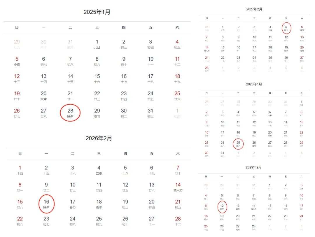 何永杰表示,农历2024年-2028年的腊月初一,“日月合朔”时间均早于11时15分56秒:2024年12月31日6时26分33秒(农历2024年)、2026年1月19日3时51分42秒(农历2025年)、2027年1月8日4时24分05秒(农历2026年)、2027年12月28日4时12分0秒(农历2027年)、2029年1月15日1时24分10秒(农历2028年)。因此,这5年的腊月均为小月,没有“大年三十”,除夕为腊月二十九。