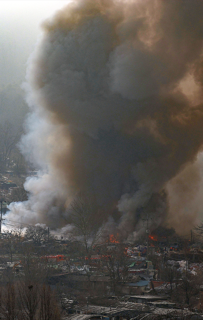 1月16日,韩国首尔,一处火灾现场浓烟滚滚。
