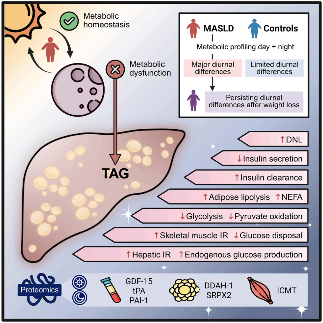 然而,尽管肝脏代谢与昼夜节律系统内在关联,但对于患有代谢功能障碍相关脂肪性肝病(MASLD)的患者,其昼夜血糖和血脂处理情况却从未有过详细评估。因此,了解该患者群体中组织特异性的每日代谢节律,将有助于我们加深对疾病发病机制的理解,并为利用或调节生物节律以改善代谢和肝脏健康的实际方法提供信息,从而为包括 MASLD 在内的患者确定热量摄入、运动和用药时机(时辰药理学)的最佳时间窗口。