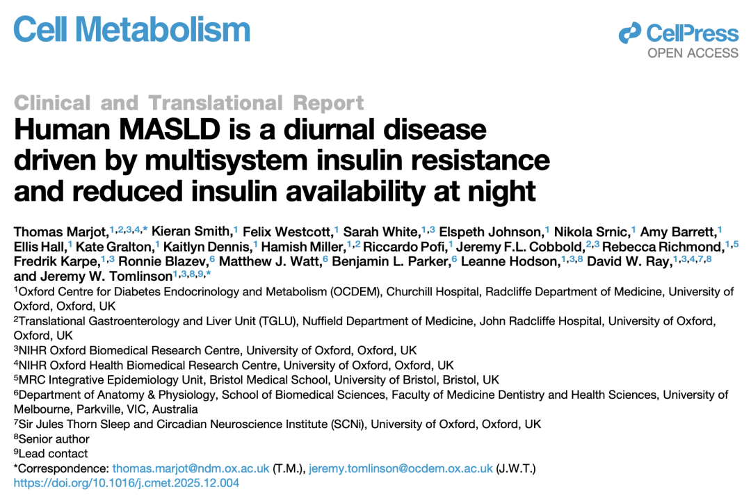 2026 年 1 月 12 日,牛津大学的研究人员在 Cell 子刊 Cell Metabolism 上发表了题为:Human MASLD is a diurnal disease driven by multisystem insulin resistance and reduced insulin availability at night 的研究论文。