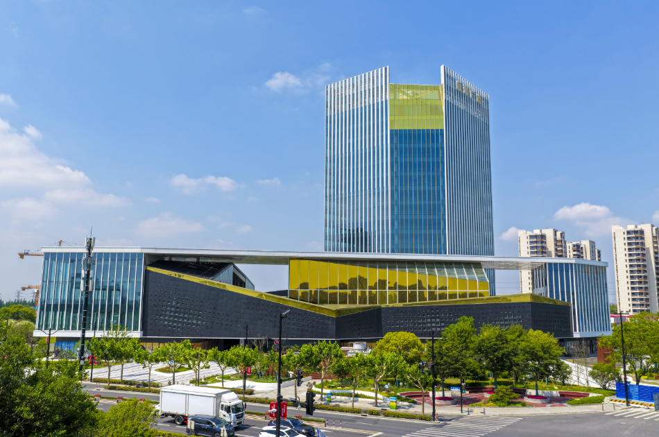 远眺金环广场,高层塔楼以竖向线条勾勒出“高山流水”的建筑形态,浅灰色金属板与玻璃幕墙相结合,顶部镶嵌的金色装饰巧妙呼应“金环”之名;商业裙楼则以“古琴宝匣”为原型横向舒展,折线元素又与塔楼形成视觉联系,整体形成“高山流水觅知音”的概念,把东方意境搬进了现代建筑。凭借卓越的施工细节和建筑品质,项目还入选了上海市建筑行业工程质量的最高荣誉“白玉兰奖”。
