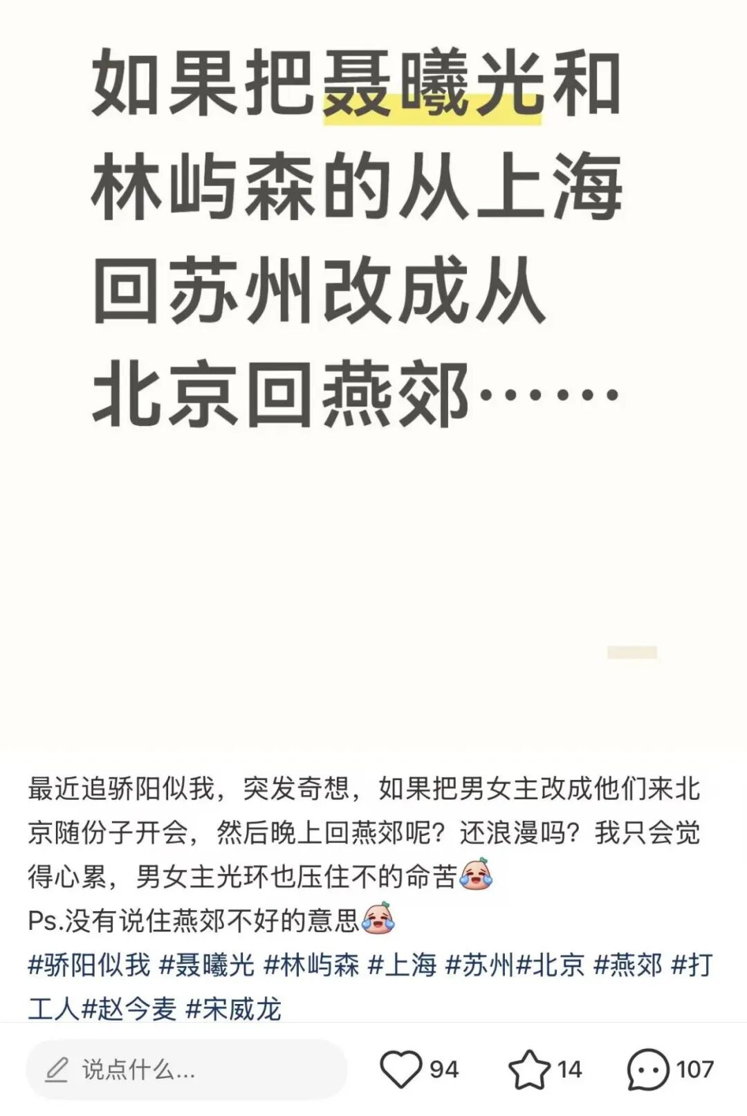 北京是一个很好的对照。这座城市当然重要,也当然宏大,但却并不适合恋爱发生。男女主只要不在同一个区,就很容易活成异地恋。有网友吐槽《许你耀眼》里,男主在望京上班,女主在丽泽上班,直线距离27公里,接人下班要一个多小时,稍微堵车就能直接错过晚饭。这种真实,放在现实题材里是加分项,放进现偶,却很容易把观众拉回日常焦虑。