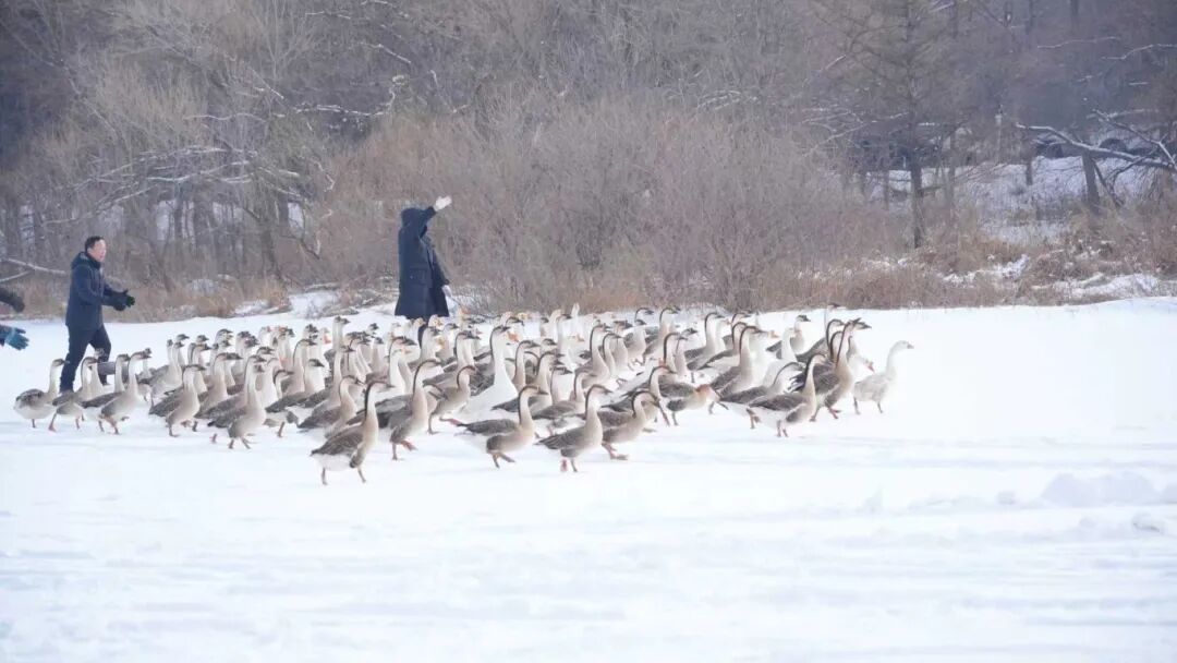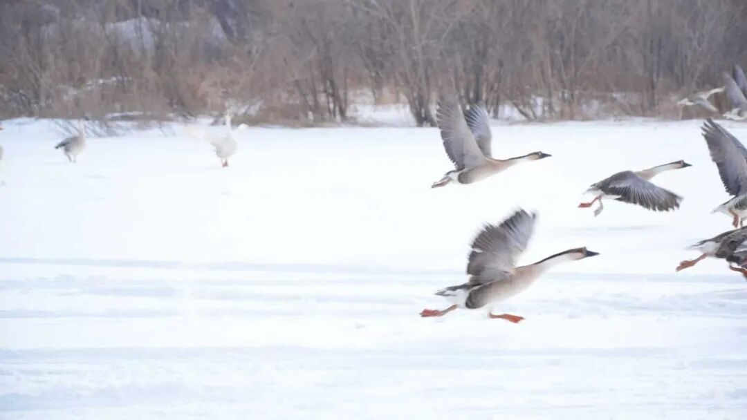当千羽彩头雁自岸边齐飞,翩跹掠过如镜冰面,活动被推向又一高潮。雁群与跃冰的鲜鱼相映成趣,勾勒出“鱼雁同欢、生灵共荣”的生态画卷,恰是净月潭多年来坚守生态保护的生动写照。