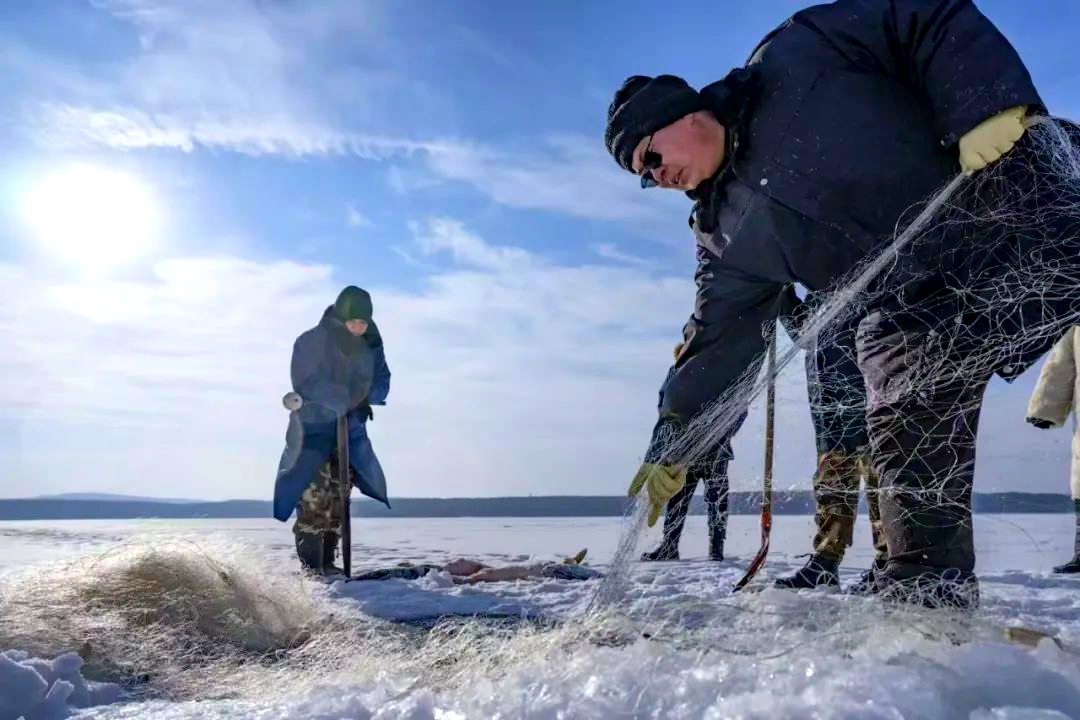 有着数十年经验的鱼把头袁明国,凭借祖传技艺与对净月潭水情的精准把控,选定捕鱼核心区域。渔工团队默契配合,凿冰、布网、牵绳,2000米渔网在机械助力下缓缓收拢,顷刻间无数鲜鱼腾跃而出,“潭鱼跃冰”的壮观景象引得现场掌声雷动,第一网捕捞量预计超万斤,丰收气息扑面而来。