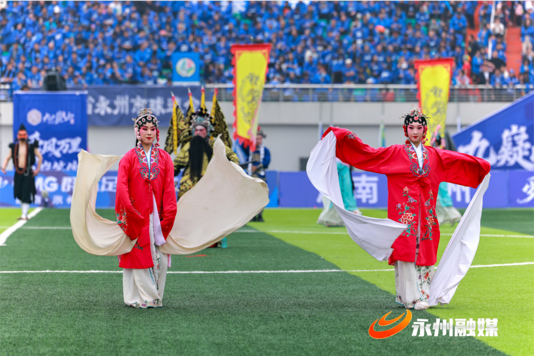 开幕式在融合音、舞、体元素的非遗秀等文艺表演中拉开序幕。随后,内蒙古呼和浩特队、山东泰安队、黑龙江哈尔滨队、广东湛江队、青海玉树队以及东道主“湘超”冠军湖南永州队六支参赛队伍挥舞各自的战旗一一亮相,齐聚绿茵场。