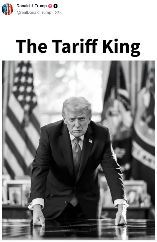 同日,特朗普在“真实社交”平台发布一张个人黑白照片,并自诩为“关税之王”。