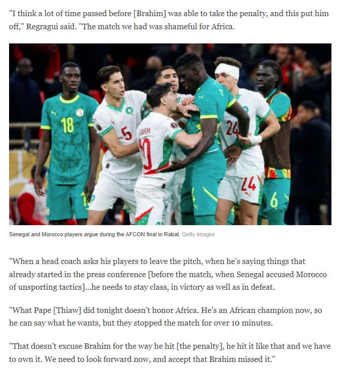 “我认为布拉希姆在罚点球前过了很久才缓过神来,这影响了他的发挥,”雷格拉吉说。“我们这场比赛的表现对非洲来说是耻辱。”