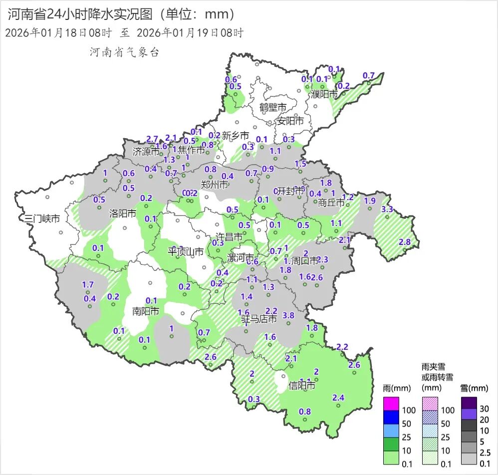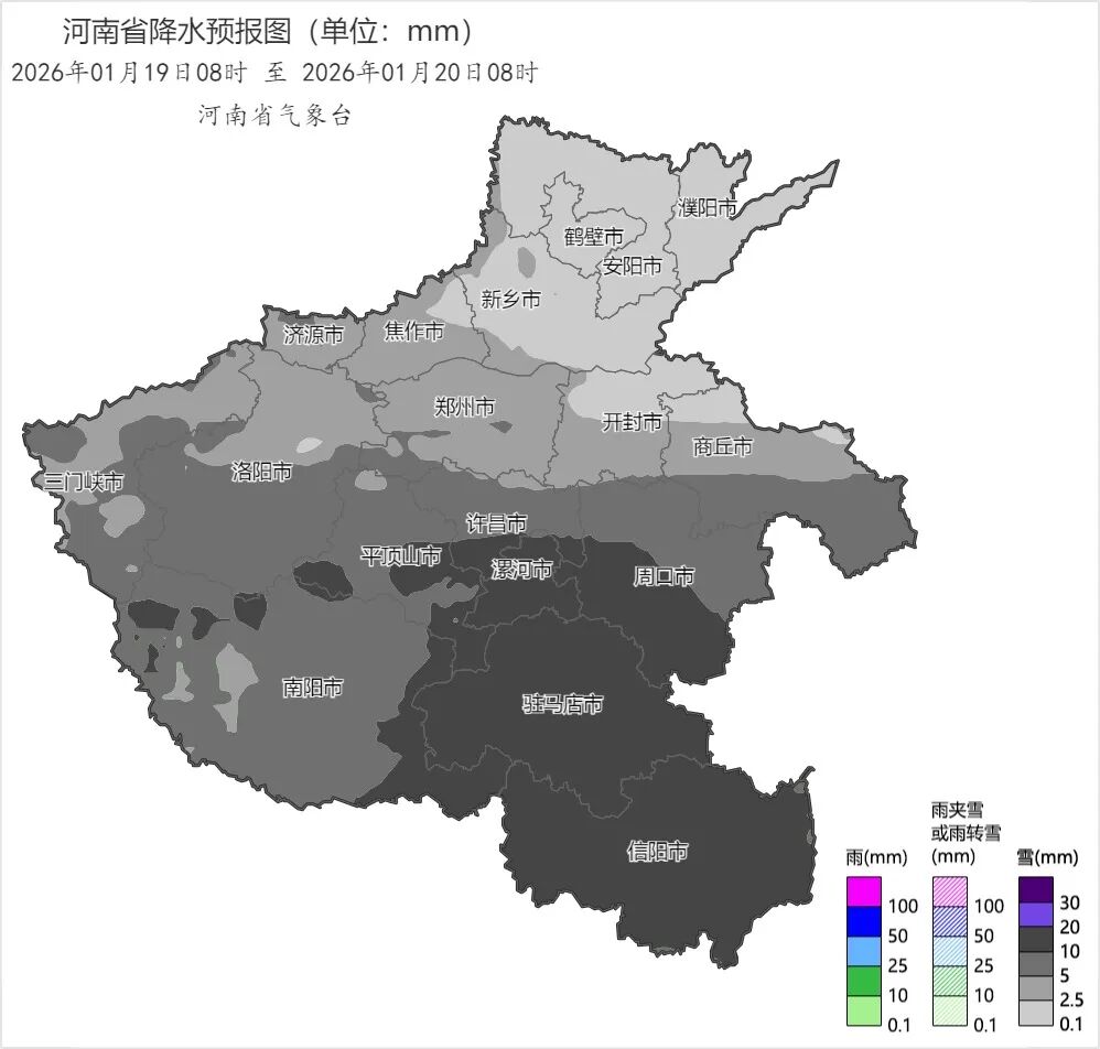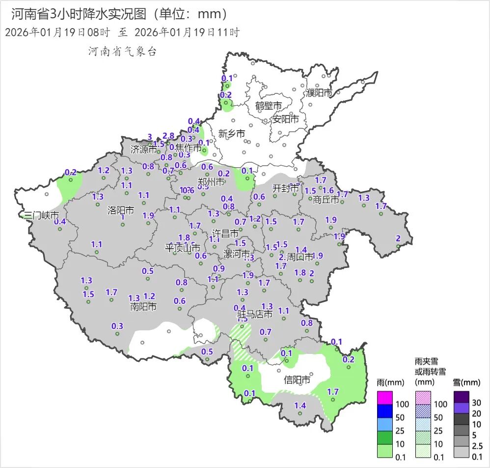 昨天(18日)白天到今天早上,河南大部地区雨雪天气逐步登场,尽管量级不大,但配合上冰冷的北风,寒意十足。随着气温的进一步下探,今天上午,除东南部外,大部地区已完成由雨到雪的转换。