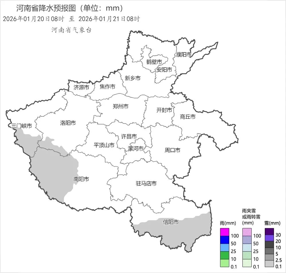 今天下午到夜里,全省阴天,沿黄及以南有中到大雪,洛阳南部、平顶山中南部、许昌南部、漯河、周口、南阳、驻马店、信阳部分县(市、区)有暴雪,其中信阳南部局部大暴雪;其他县(市、区)小雪;信阳有短时冻雨。