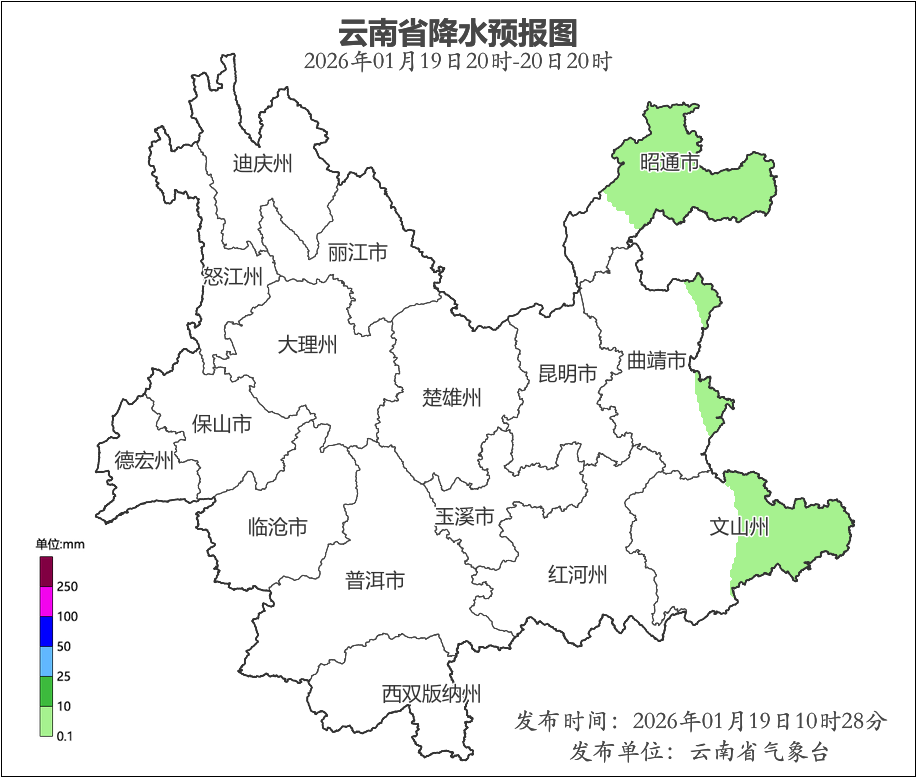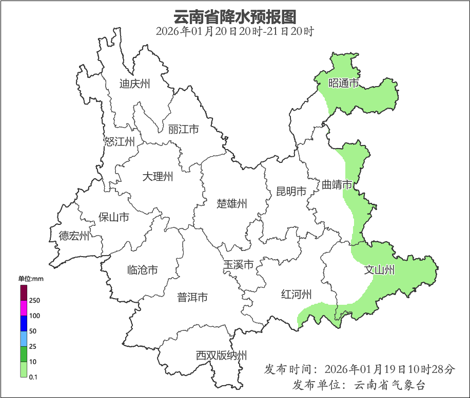 1月19日20时到1月20日20时:昭通市北部、曲靖市东部、文山州东部阴有零星小雨,昭通市北部高海拔地区有雨夹雪或小雪,其他地区晴。