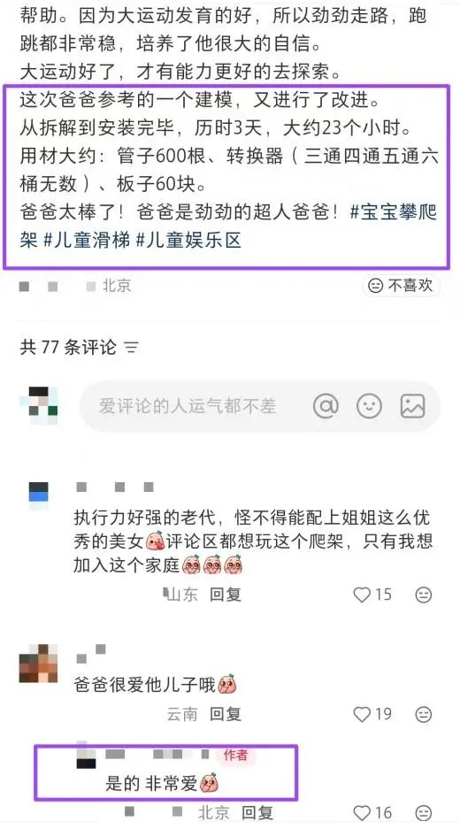 为培养劲劲的大运动能力,代旭在家里安装了一个攀爬架。他没找工人,而是自己一个人爬上爬下,花费三天从无到有搭建了起来。
