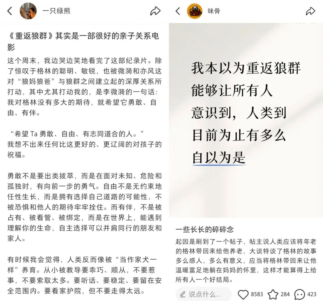 与此同时,更多深度解读与理性思辨也在小红书、B站等平台涌现,让《重返狼群》超越了单纯的情感故事。不少用户在小红书发布自己的长篇影评,不仅梳理了纪录片的完整脉络,还深入解读了故事背后的细节。