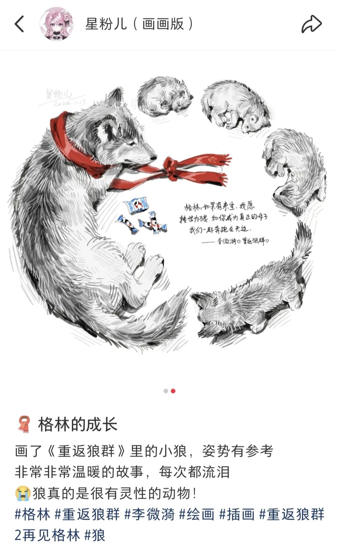 《重返狼群》记录了野生动物画家李微漪救助并成功将小狼“格林”送归草原狼群的真实经历,该片原型故事曾于2012年以书籍形式出版并受到关注,后又被李微漪和彼时的伴侣亦风用镜头记录下来,2017年纪录片《重返狼群》上映,而将近十年后,这些珍贵片段通过短视频重新进入公众视野。