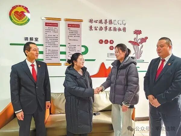 图为在法官宋鑫(左一)、吴东冬(右一)的调解下,双方当事人握手言和。杨文璐 摄