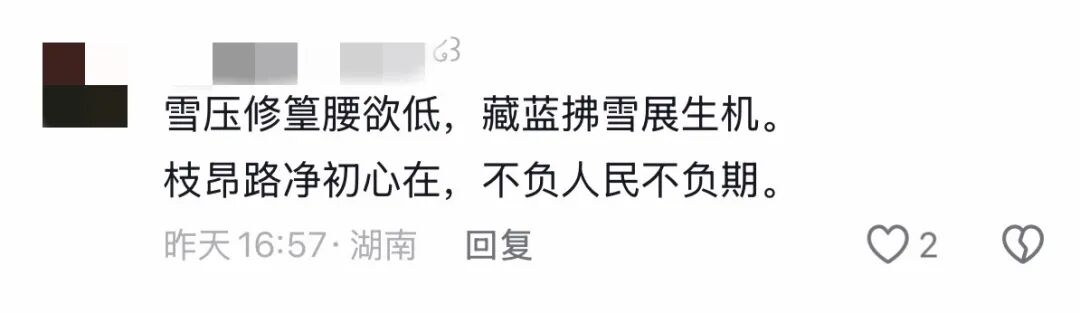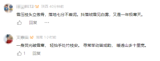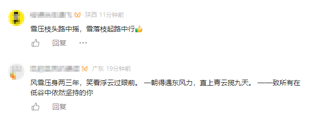 网友霞霞表示突然想到一句诗:“雪压枝头低,虽低不着泥;一朝红日出,依旧与天齐。”