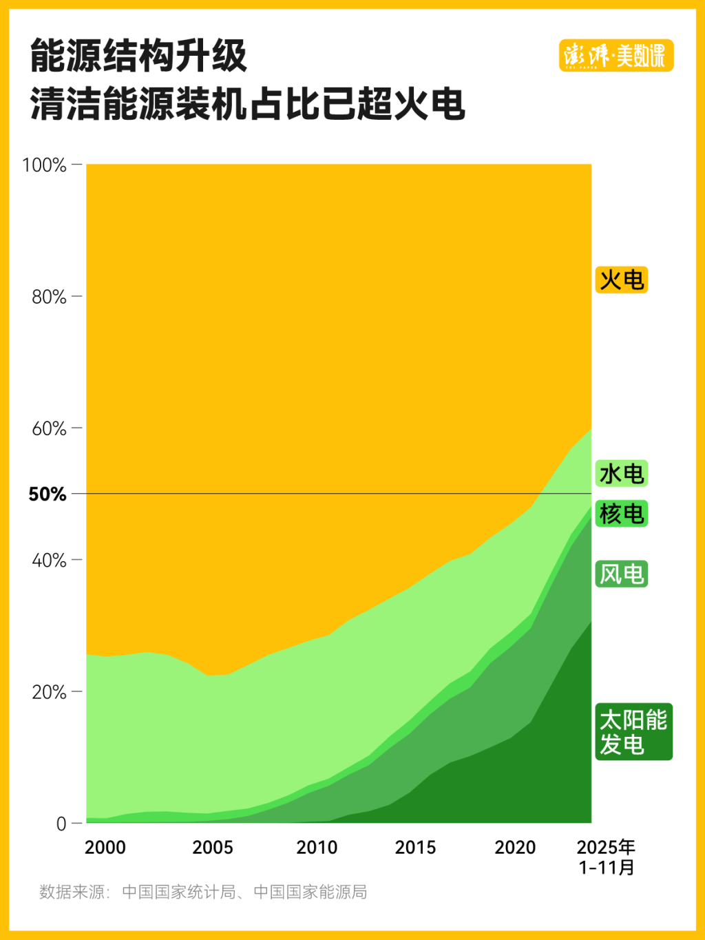 电力结构也更加清洁。早在2023年,中国非化石能源(水电、核电、风电、太阳能)装机占比就达到了52.4%,历史上首次超过化石能源。火电在总装机容量中的占比从2000年的74%大幅下降至2025年11月的40%。