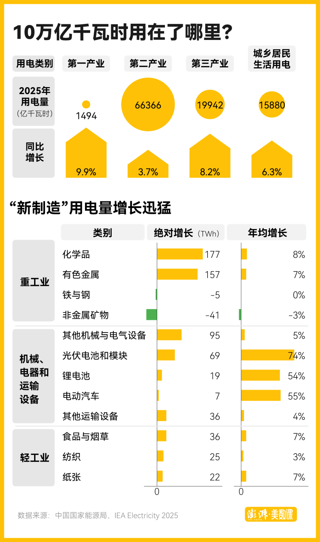 纵向对比,根据国家统计局的数据,2025年用电量相当于15年前的2.5倍,25年前的7.7倍。“十年间用电量从5万亿度(千瓦时)到10万亿度,这样的增长速度在全球主要经济体中绝无仅有。”中国电力企业联合会常务副理事长杨昆对澎湃新闻表示。