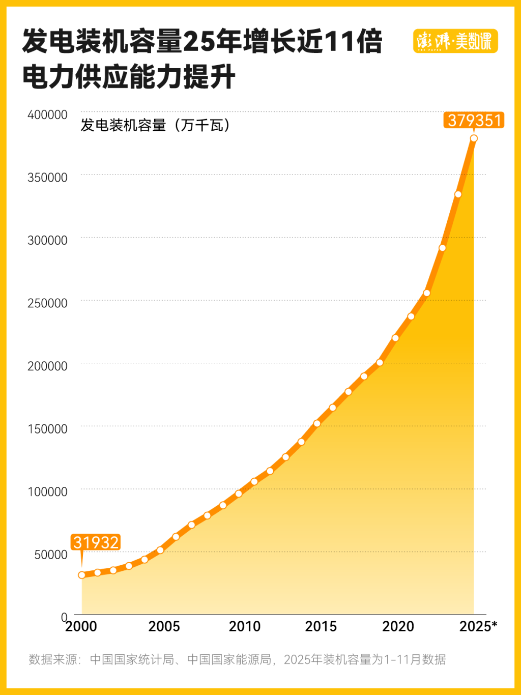 截至2025年11月底,全国累计发电装机容量37.9亿千瓦,同比增长17.1%。随着发电装机容量逐年提升,25年间增长近11倍,全国电力供应能力大幅增强。